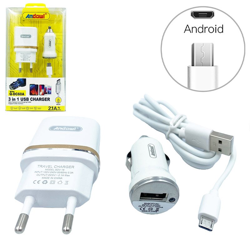 Φορτιστής Σετ Αυτοκίνητου Και Πρίζας 3 Σε 1 Με Θύρα USB-A Και Καλώδιο Micro USB 100cm Q-DC60A Λευκό